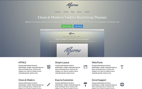 Alfaroa is a clean, modern and responsive Twitter Bootstrap theme that is perfect for corporate or business use. Minimal use of images makes it very easy to customize. Includes 8 page layouts and easy to use web fonts.